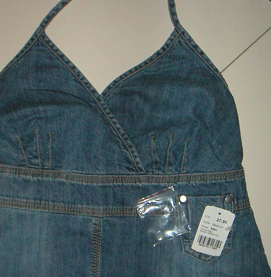 Als kostenbewusste Smart-Shopperin komme ich schon mal auf die Idee im Vorbeigehen bei Schöps die Auslage zu scannen. Das geht meistens recht schnell, weil sich in der Regel nichts, was einen 2. Blick wert ist, findet. Neulich irritierte mich aber doch irgend etwas, und beim 2. Hinsehen wurde klar: Da gibt es ein interessantes Sommerkleidchen aus Denim, und zwar ein Holterneck mit leicht ausgestelltem Rockteil in heller Waschung.
