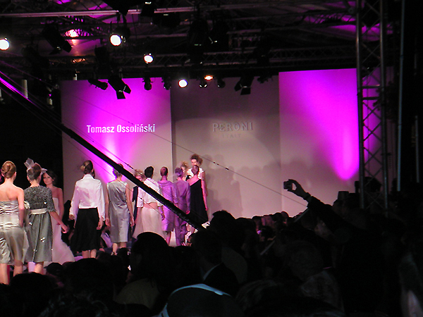 Für Backstage-Zelt, Catwalk und üppige VIP-Party-Zone der Peroni Fashion Show sperrte man die Einkaufsstraße Nowy Swiat gleich über ihre gesamte Länge. Mit der obligaten 1-Stunden-Verspätung machte der italienische Bier-Brand dann so richtig auf schick – Imagetransfer nennt man das im Marketingjargon – und zwar mit Hilfe von 3 jungen polnischen Designern: Blaues Blut Tomasz Ossolinski, Wojtek Dziedzic, der schon bei Labels wie Feretti oder Jil Sander tätig war und Kostümbildnerin Malgorzata Krzemien.