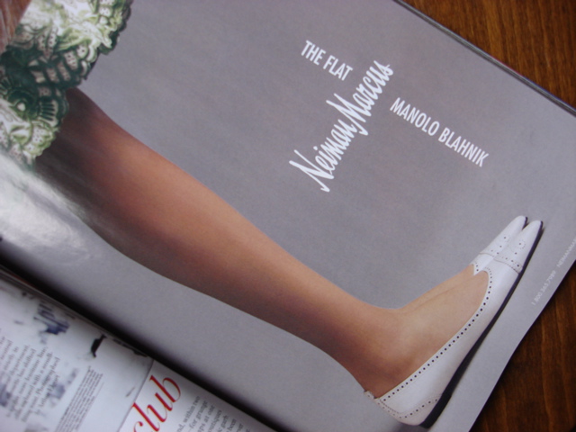 Bin ich froh. Ich hab in der aktuellen US Vogue eine Anzeige mit flachen (!) Manolos gesehen. Das beruhigt mich. Wenn der New Yorker Department Store Neiman Marcus das inseriert, dann deutet das auf eine mögliche Trendwende hin.