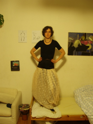 Das also ist Haldis. Hier seht ihr sie in einer Art besticktem, zipfeligen Ballonrock aus Nyonstoff, komplett mit schwarzem Palmers-Body und goldenen Ballerinas. Das war Haldis Beitrag zum Flüchtlingsball vorige Woche im Rathaus. Der Rock ist eine Leihgabe von Nomi Goldfarb, für deren Wollkreationen sie öfters Verschlüsse und Nadeln anfertigt.