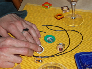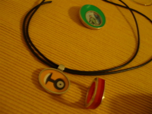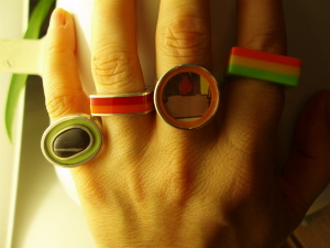 Gefundene Gegenstände des Alltags wie Kieselsteine oder Comics werden von Haldis in neuen Kontext gestellt und weiter zu Schmuckstücken. Beim Finden einiger Kieselsteine war ich dabei: Da machten wir samt Söhnen einen Ausflug nach Neusiedl am See… Aber auch Zeichnungen ihres Partners, des genialen und von mir sehr verehrten Klaus Tschabitzers http://www.schwimmer.at/, werden kopiert und verkleinert für Ringe, Armreifen und Halsschmuck in Besitz genommen.