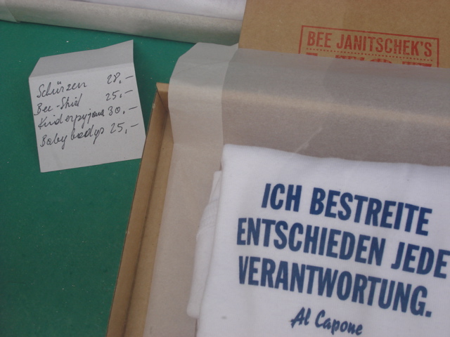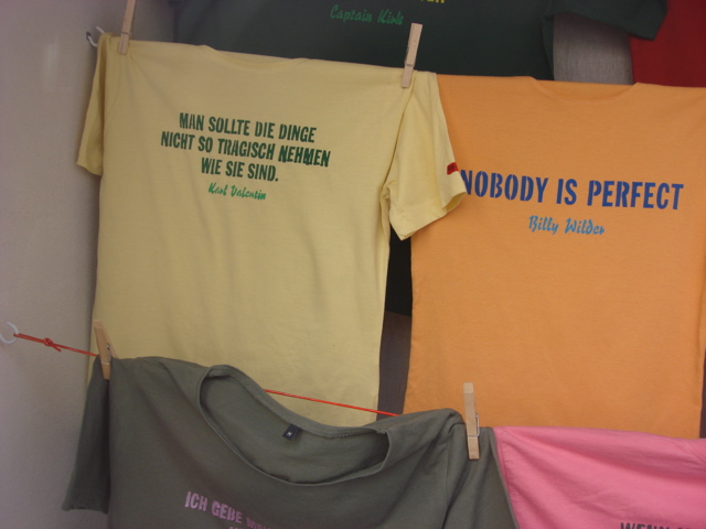 Und Biene Janitschek hängt ebenda ihre äusserst denkwürdigen, auf T-Shirts und Schürzen gedruckten Zitate in die Auslage.