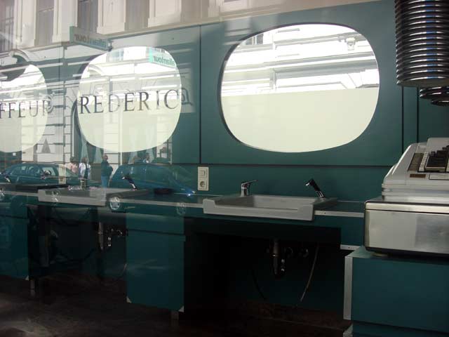 Die zweite Entdeckung des heutigen Tages ist ein leider geschlossener Friseursalon in dem Gebäude am Parkring, wo sich auch das wunderschöne Gartenbaukino aus dem Jahr 1960 befindet. Der absolut schick ausgestattete Salon Frederic ist zu mieten und sollte doch unbedingt samt historischer Innenausstattung gerettet werden!