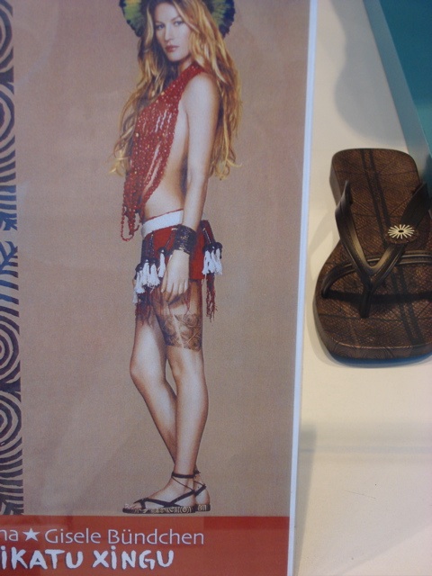 Trotzdem oder gerade deswegen freut es mich dann beinahe hämisch, wenn’s mal nicht so gut gelingt, auch wenn dabei die göttliche Gisele Bündchen die Leidtragende ist. Auf dem Kampagnenfoto für ihre politisch korrekten Flip-Flops ist offenbar irgendwer ausgerutscht, der Oberkörper gleich lang wie die Beine geraten, und das Gesicht – wie soll ich sagen – erinnert mich mehr an eine Mühlviertler Bäuerin. Das war vielleicht sogar gewollt, um eine quasi ursprüngliche Nähe zu den brasilianischen Kisedje-Ureinwohnern zu suggerieren, an die ein Teil der Verkaufserlöse fließen soll. Durch die Kratzer wird die Illusion des Schönheitsideals erst so richtig bewußt. Das ist doch fein!