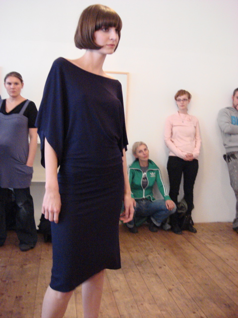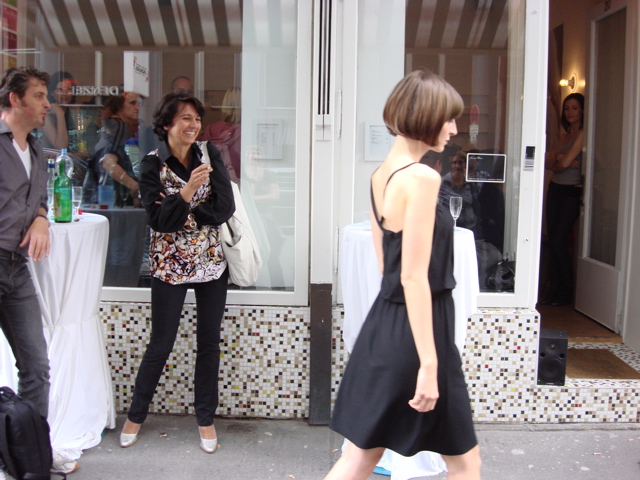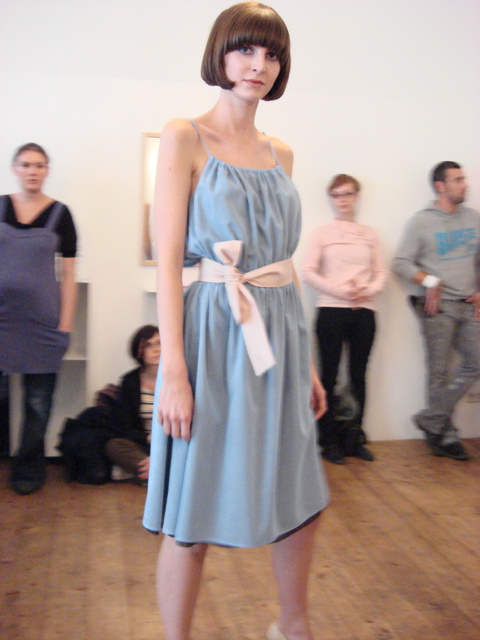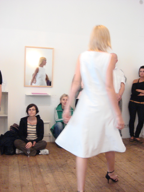Im eher kleinen und angenehm unaufgeregten Kreis drehten die 2 Models zu Sounds aus dem Ipod (schicke Remakes aus den 70ern) ihre Runden durch das ausgeräumte Coiffeur-Lokal auf den Gehsteig und zurück. Sie trugen ausschließlich Kleider in elegant-sachlichen schmalen Linien aus feinen Jerseys und Crepes in weiß, rot, schwarz und wenig grün und blau.