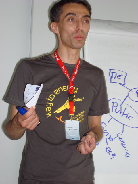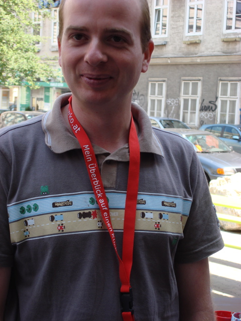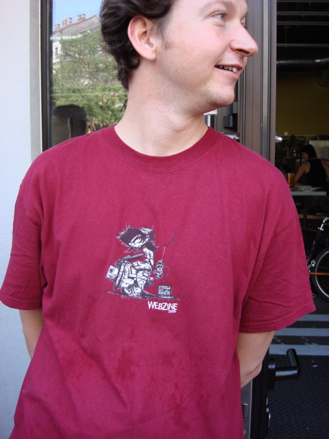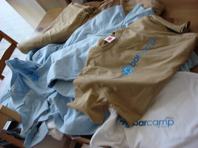 Wolfgang im Andenken an das Webzine 2005 Treffen, Martin in einem limited edition Retrogame-Polo von Chunk und Hannes in einem ziemlich Energie geladenen Teil, dessen Herkunft mir leider verborgen blieb. Und mein Barcamp Shirt werde ich mir sicher aufheben, nur mit diesem hochgeschlossenen Männer-Ausschnitt muss ich was machen…