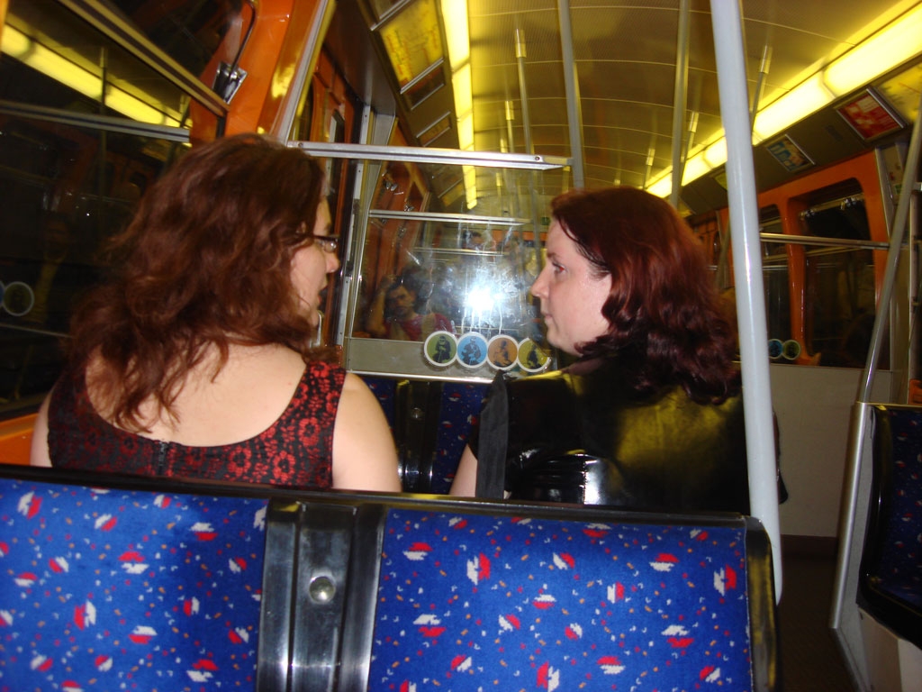 Da stachen mir zwei schöne, außergewöhnliche Frauen ins Auge. Die beiden sassen vor uns und ich hab sie gleich verschämt und auch ein wenig feige von hinten geknipst. Als sie das bemerkten, fasste ich mir ein Herz und lichtete sie auch von vorne ab. Erst nachdem sie ausgestiegen waren, wurde uns bewußt: Heut findet die Loveparade statt!
