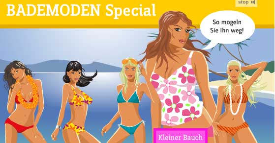 Bei La Redoute – Gloria ist hier ja eigentlich die Spezialistin – stelle ich leider fest, dass mein Favorit in Rot erst mit 1o Wochen Lieferzeit zu haben, allerdings mit € 17,90 extrem günstig ist. Problemlösungsorientiert geht’s auch Universal an. Das aktuelle Bademoden Special bietet praktische Sofort-Tipps, z.B. „Kleiner Bauch – so mogeln Sie ihn weg!“ Hm, die Fotos mit den dazu empfohlenen Modellen zeigen allerdings aussschließlich schlanke Schönheiten – sind die Bäuchleins jetzt schon so gut weggemogelt oder wie? Das ist mir zu unglaubwürdig. Und außerdem hab ich die musikalische Endlosschleife langsam satt.