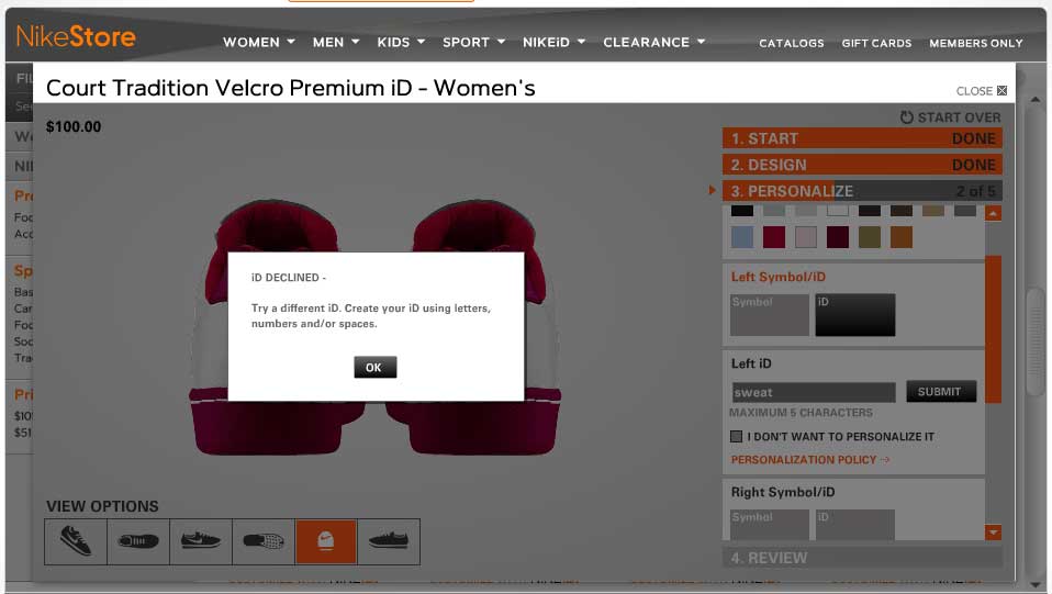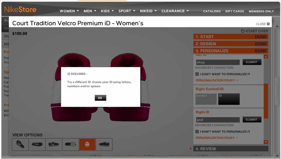 Was auch nicht geht, sind natürlich als inappropriate eingestufte Ausdrücke, und schon gar nicht solche, die ein vermeintlich schlechtes Licht auf das Unternehmen werfen könnten. Nikes Emailverkehr mit einem Kunden, der seine customized Schuhe mit der ID „Sweatshop“ versehen wollte, gelangte 2001 zu einiger Berühmtheit. Das ist lange her, aber vielleicht ein Grund, weshalb Promotions derzeit anscheinend nur auf geschlossenen Benutzergruppen getestet werden, etwa im Frühjahr auch auf Sneakerplay.