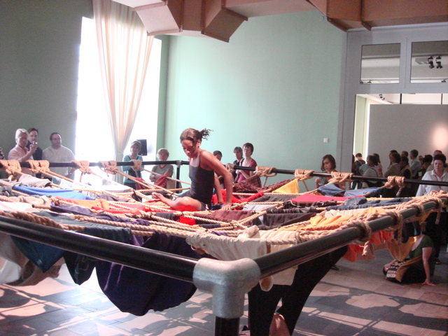 Im Fridericianum laufe ich mehr zufällig als geplant in Trisha Browns Performance Floor of the forest (1970), in der sich TänzerInnen durch eine Installation aus netzartig aufgespannten Kleidungsstücken bewegen: