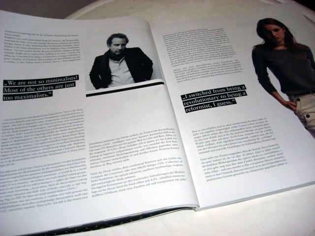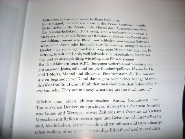 Trotzdem ließ mir bei der Lektüre des aktuellen Heftes Manches keine Ruhe. Das Portrait über Jean Touitou, Gründerfigur des Modeunternehmens A.P.C. zum Beispiel: Dass die Autorin die Entwicklung des „Atelier de Production et de Création“ seit 1987 von einem Studio mit stark reduzierten Entwürfen und politisch links orientiertem Umfeld zu einer Firma mit 40 Millionen Euro Jahresumsatz etwas platt als Konvertierung vom Kommunismus zum Kapitalismus interpretiert, ist schon seltsam genug. Dann noch die Frage, ob es „… am Ende nicht konsequent (wäre), sich der Mode komplett zu verweigern… “ – was soll man sich dazu bitte vorstellen? Revoluzzer haben gefälligst arm zu bleiben oder wie?