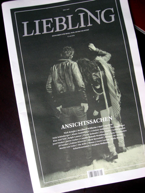 Liebling ist eine feine Berliner Zeitung für Mode, Film, Musik und Kunst und jetzt auch bei uns erhältlich. Schwarz/weisses Cover auf mattem Zeitungspapier, viel fundierter Text, klares, recht klassisches Layout, saubere Typographie und vor allem das herrlich grosszügige Format (30×47) machen das mehr als 100 Seiten starke Ding ziemlich einzigartig in der bunten Hochglanzmagazinumgebung.