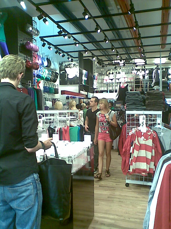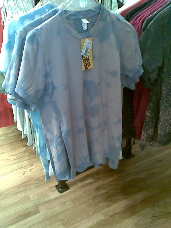 Was ich jetzt aber beim Reality-Check im ersten Wiener American Apparel Laden gesehen und angegriffen habe – das Probieren habe ich mir nach Gerlindes Hinweis auf den Jezebel’schen Selbstversuch erspart – war schlicht und ergreifend enttäuschend: Schleissige Nähte, viel Kunstfaser und schlabbriger Jersey bei Modellen, wo er nicht sein soll – wer je ein richtig gutes Schlabbershirt gehabt hat, etwa von C & C California oder American Vintage oder ganz einfach ein 100 Mal gewaschenes Leiberl vom Flohmarkt, weiß wovon ich rede.