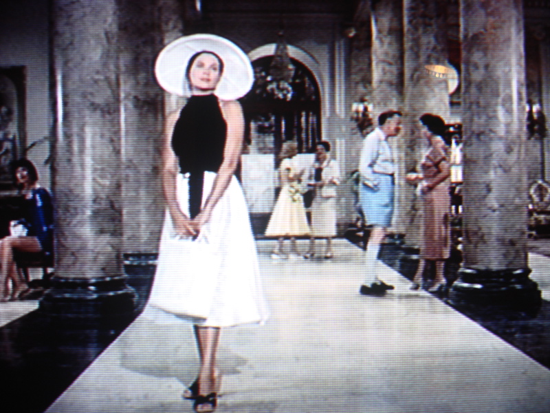 Das schwarz-weisse Strandoutfit mit breitkrempigem Sonnenhut und Holderneck, der sich später als Badeanzug entpuppen wird, ist mein klarer Favorit!
