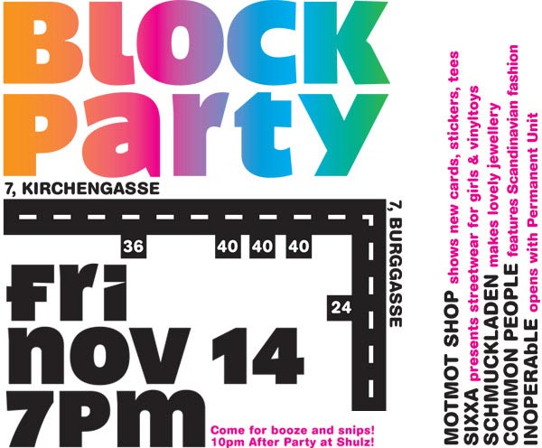 Und da kommt sie schon, die gute Gelegenheit: Blockparty im Viertel Burggasse/Kirchengasse im 7. Wiener Bezirk am Freitag, den 14. November! Die Party steigt ab 12 Uhr mittags bei Motmot, Schmuckladen, Common People, Inoperable Gallery und dem supersymphatischen sixxa dinghy store von Kathi Macheiner.