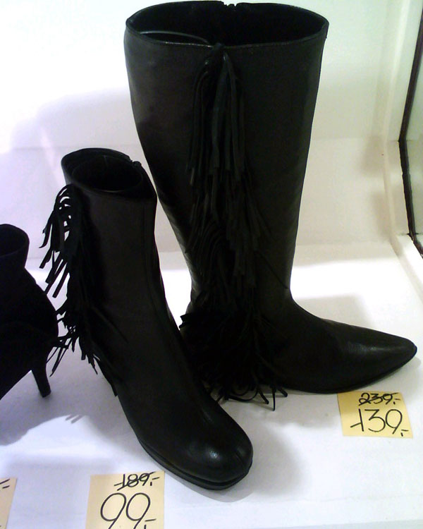 Da mußte ich doch heute am Heimweg an Gerlinde denken, die mir im Interview – coming soon, versprochen – von Agathe erzählte. Sie soll in ihrem Blog Style Bytes vor bald einem Jahr diesen Fransenboothype losgetreten haben. Und solche Exemplare gibt’s jetzt also hier im Ausverkauf, nur für den Fall, dass die jemand wirklich noch will.