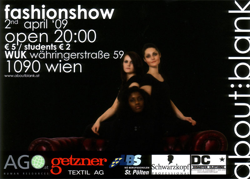 Unter dem Motto about:blank, das sich auf eine neu geöffnete Internetseite bezieht, präsentieren am Donnerstag, den 2. April erstmals 21 DesignerInnen der Modekollegs Herbststraße im Wiener WUK ihre Arbeiten.