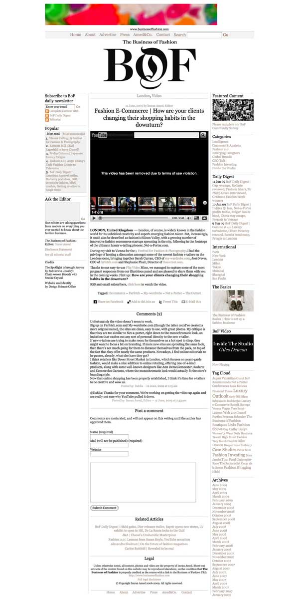 Zu früh gefreut habe ich mich heute morgen, als ich in meinem RSS Feed den Beitrag How are your clients changing their shopping habits in the downturn? vorfand. Herausgeber Iman Amred versuchte mit einem ersten Video eine Reihe von Aufzeichnungen des Fashion 2.0 E-Commerce Day zu starten.