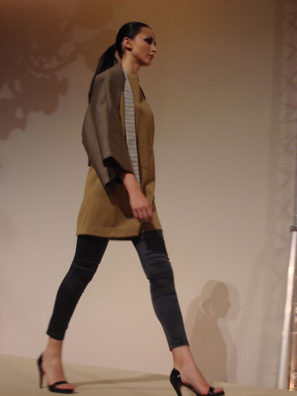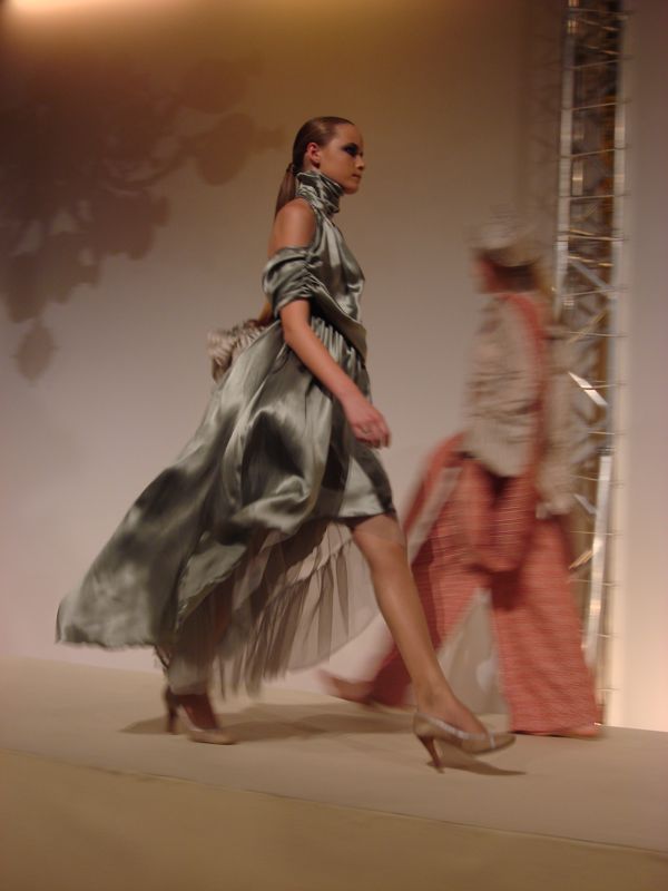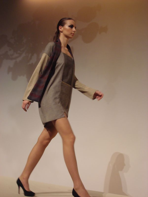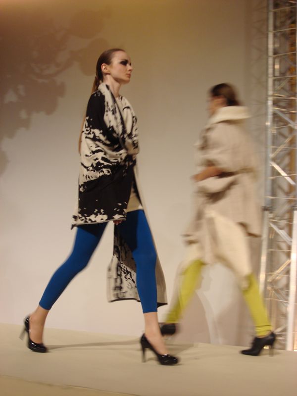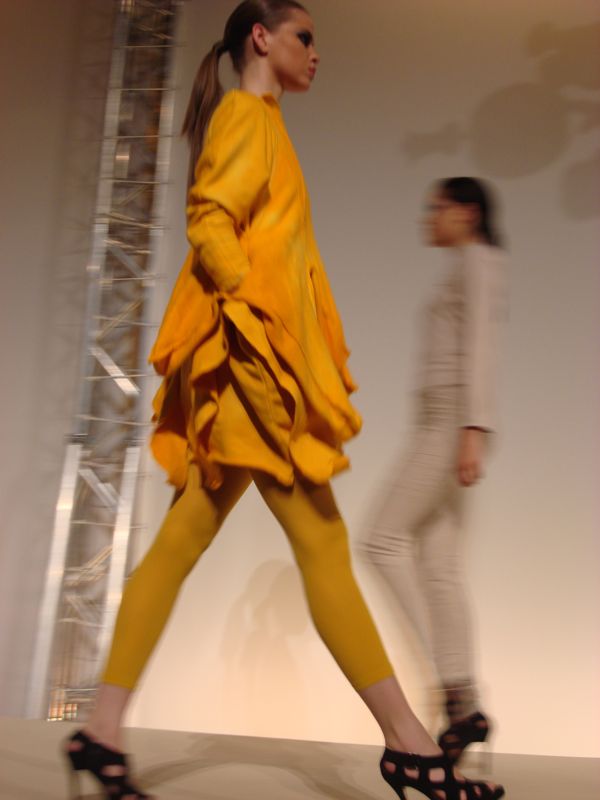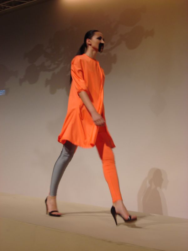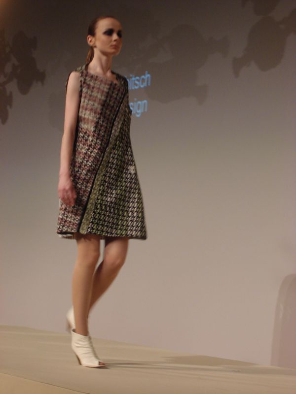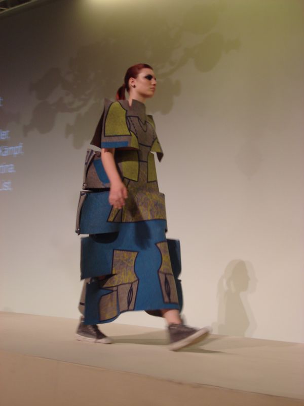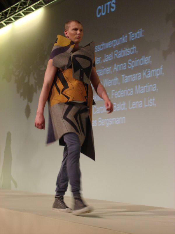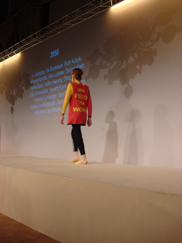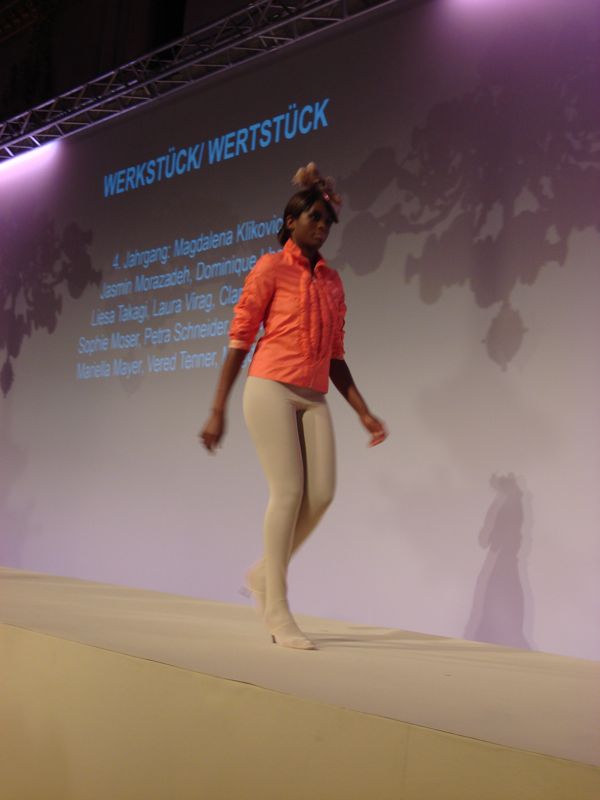 Heuer zeigten etwa die ersten AbsolventInnen des Bakkalaureat-Studiums ihre Abschlusskollektionen, die in ihrer Individualität und Umsetzungsstärke die (hiesige) Konkurrenz nicht zu scheuen brauchen. Ich merke mir davon mal Milena Leszkowicz für gekonnt geradlinige Schnittführung und eigenwillige Farb- und Dessinkombis, Lisa Pek für das Ensemble in orange, in das ich mich sofort hineinkuscheln möchte und Brigitte Mair für sprichwörtliche Vielschichtigkeit.