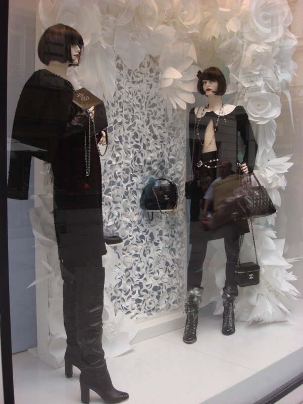 Viele Accessoires, Cash-Cow der Modekonzerne, sind zu sehen. Schwarz, Weiß, Kamelien und Bubikopf verweisen auf die Wurzeln des Hauses.