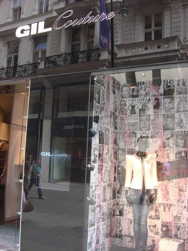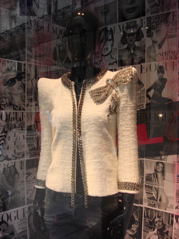 Gil Couture führt neuerdings Balmain, und hier findet sich immerhin ein Teil mit den prägnanten Schultern im Schaufenster. Schon wieder keine Farbe, spricht man sich hier ab?