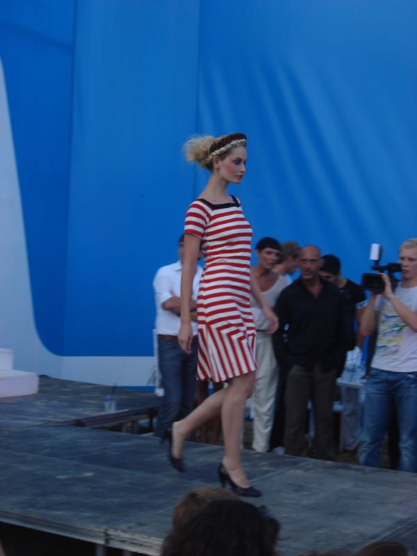 In ihrer Show war denn auch eine sehr bunt gemischte, vielfältige Kollektion zu sehen. Von asiatisch Inspiriertem reichte die Palette über Marinemode oder trompe-l’œil Drucke, die dicke Ketten gleich optisch ins T-Shirt-Kleid integrieren, bis zum abschließenden Hochzeitskleid. Das hat der etwas verspätete Wiener Bürgermeister dann immerhin auch noch mit wohlwollendem Blick begutachten können.