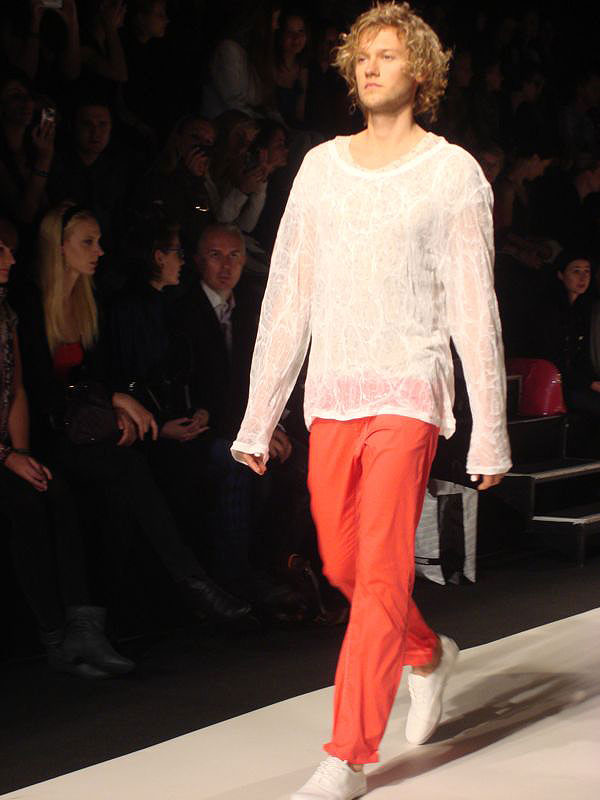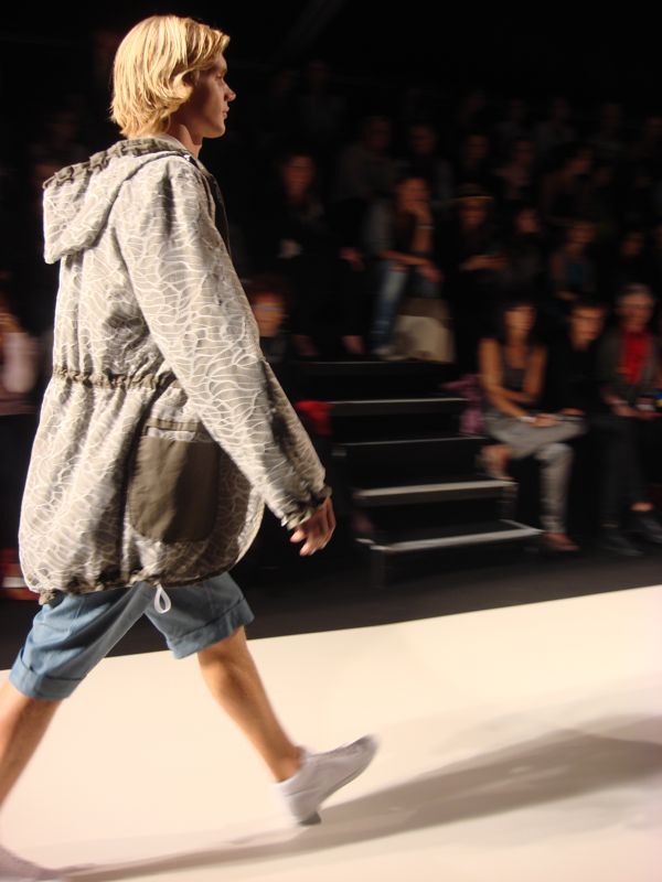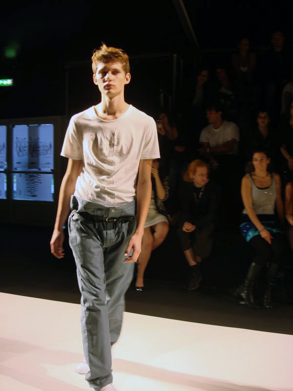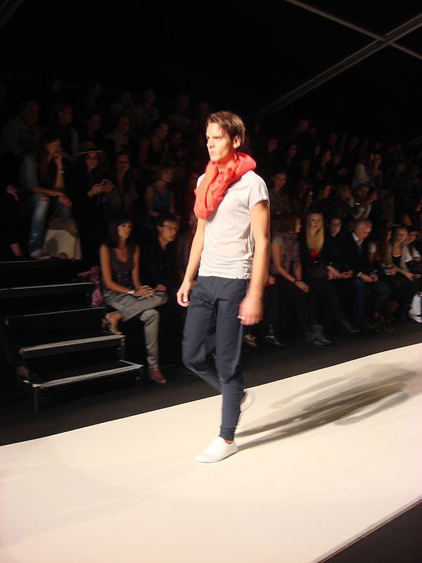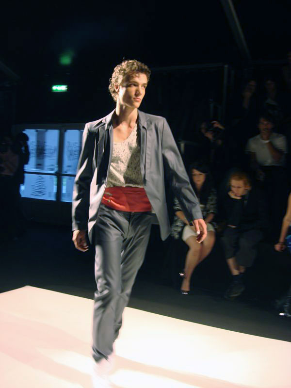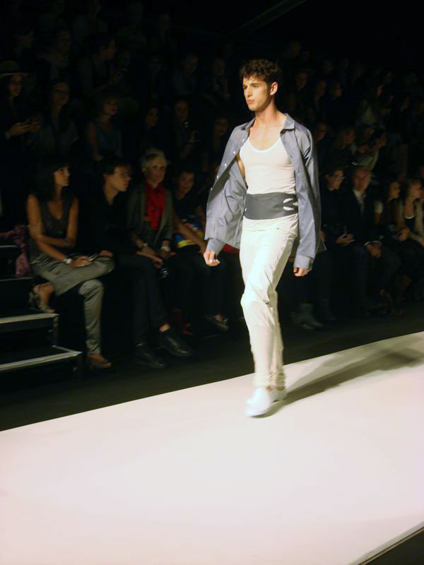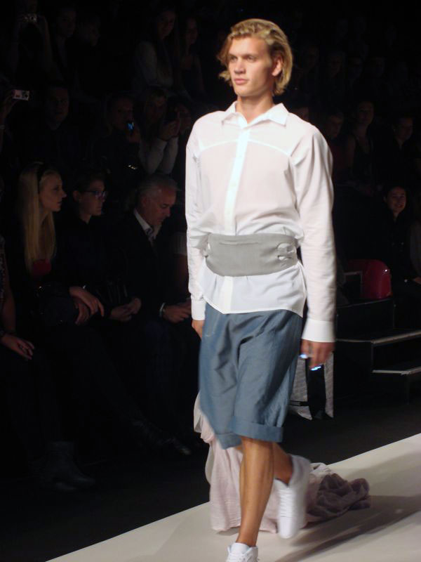 Das schwedische Label NÅ?N by KIM zeigte vergangenen Freitag recht interessante, dezente Drapierungen an T-Shirts und Hemden, raffinierte Schnittdetails bei den Hosen und etwas, wovon mir nicht ganz klar ist, ob es Kummerbund oder Bauchtasche oder beides sein könnte.