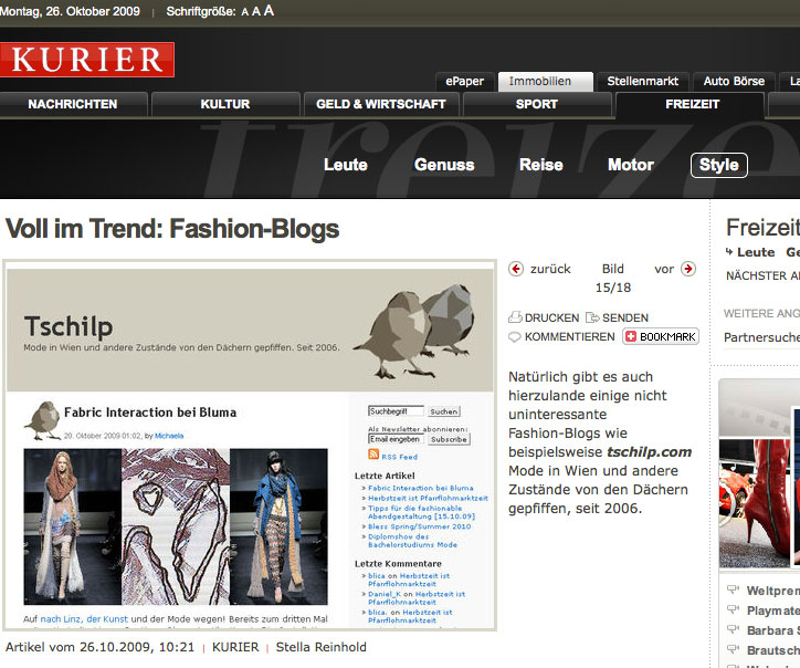 Unter dem Titel Voll im Trend: Fashion-Blogs listet nun auch die Onlineausgabe der Tageszeitung Kurier Fashionblogs. Und platziert dafür als Eyecatcher auf der Startseite ein Foto von – wie könnte es auch anders sein – Tavi. Die österreichische Abteilung besteht wieder aus – richtig geraten – Stylekingdom und Tschilp 😉