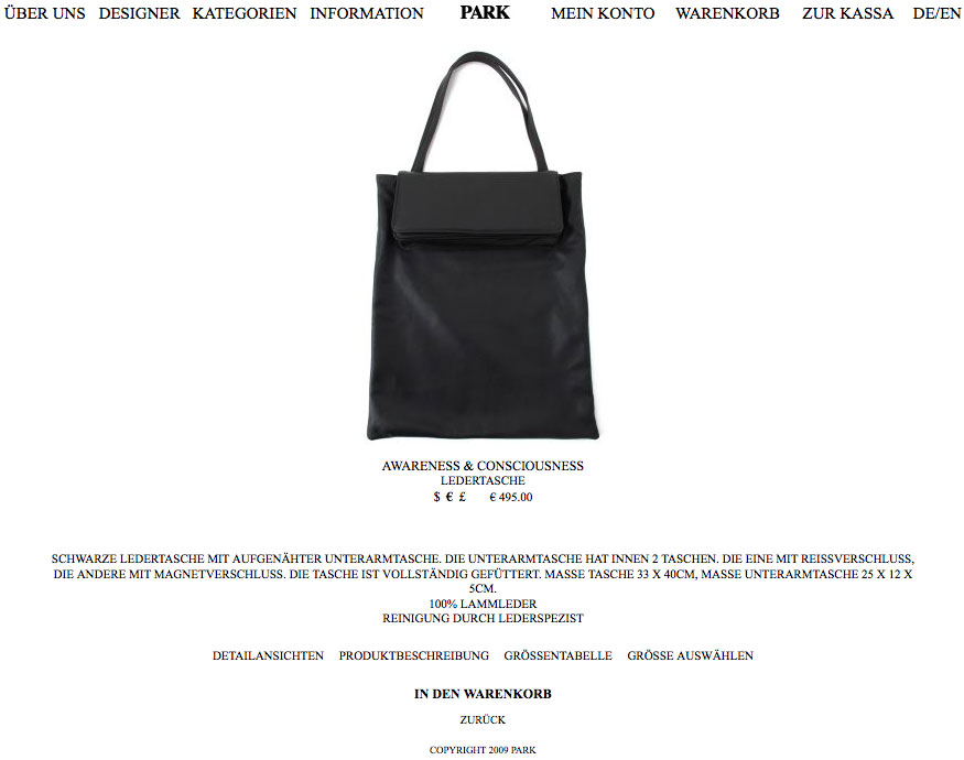 Abgerundet wird das ganze mit absolut kompetenten Produktbeschreibungen, die kurz und prägnant sowohl über Verarbeitung, Material, Tragekomfort und Pflege Auskunft geben. Und endlich ist auch jemand auf die Idee gekommen, bei Taschen – wie etwa der von Awareness & Consciousness – die Dimensionen in Zentimeter zu vermerken.