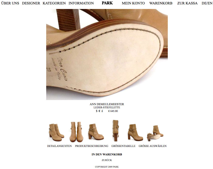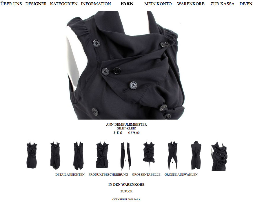 Zum Sortiment, das einem ausgewählten Teil des Angebots an internationalen und österreichischen Avantgarde Labels – Stichwort belgisches Design – im Laden entspricht, gelangt man entweder über die Designer- oder die Kategorien-Auswahl. Wirklich gut gelungen sind die Einzelansichten. Die Kleidungsstücke lassen sich hier in vielen verschiedenen Perspektiven begutachten und schön heranzoomen.