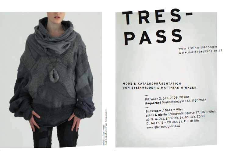 „Trespass“ – Übertreten – beschreibt die Annäherung zweier Disziplinen: Die Modedesignerin Anita Steinwidder und der bildende Künstler Matthias Winkler haben in einem gemeinsamen Projekt eine Kollektion zusammengestellt, die die Inhalte Winklers bildnerischer Arbeit mit Steinwidders Fashion Design zusammenführt.