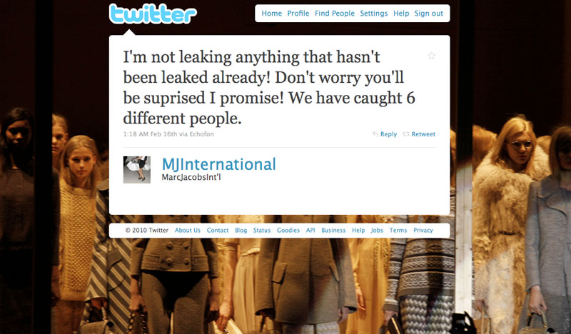Zeitweise über 40 Tweets pro Sekunde begleiteten die letzte New York Fashion Week (Hashtag #NYFW). Sie kamen von einer bunten Mischung aus Fachleuten ebenso wie von „bloß“ Interessierten. Robert Duffy, Freund und Geschäftspartner von Marc Jacobs (sein Twitter-Account wurde inzwischen, bereinigt von ein paar, dem Image des Brands wohl nicht so ganz zuträglichen Postings umbenannt) stellte höchstpersönlich schon vor der Show backstage fotografierte Looks online und meinte dazu bloß lakonisch: „I’m not leaking anything that hasn’t been leaked already!“