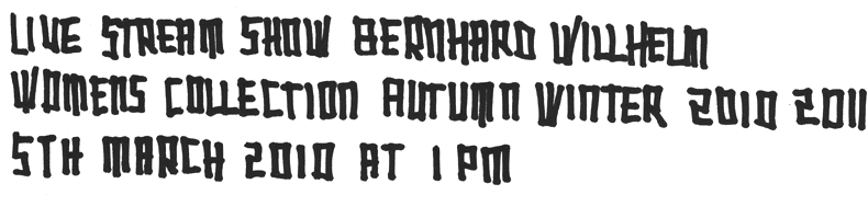 Wie schön, dass es auch anders geht: Die Damenkollektion für Herbst/Winter 2010/11 von Bernhard Wilhelm gibt es morgen Freitag, den 5. März um 13 Uhr live zu sehen. Und zwar auf der funkelnagelneuen, auf das Allerwesentlichste reduzierten Website.