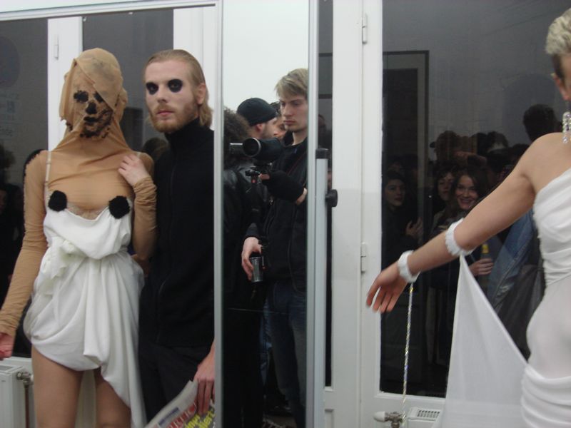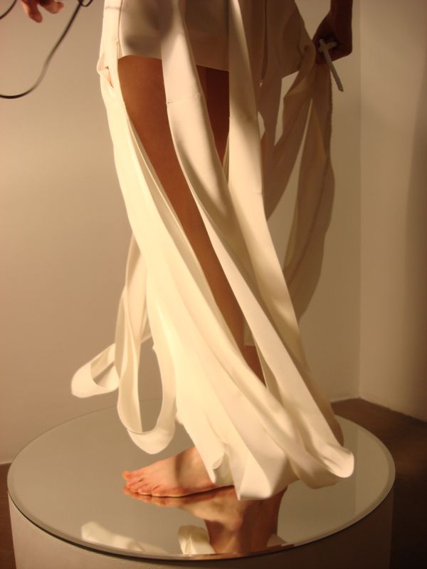 Mit dem Mittel der Performance „erklärten“ die sieben DiplomandInnen jeweils die Geschichte ihres Abendkleides aus weißem Georgette. Ein Abendkleid, gedacht für einen Vanity Ball und mit einer Geschichte „from birth to life to death of a dress“.