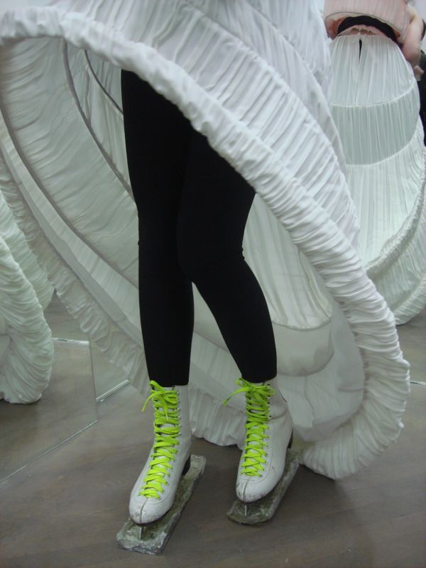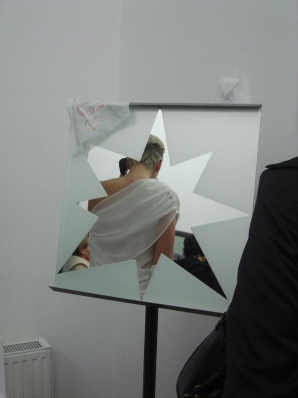 Ein Kreislauf, den etwa Andra Dumitrascu in „Die Darstellung der Leere“ untersucht. In der halbdurchlässigen Spiegelanordnung taucht das Kleid wie eine Erscheinung auf, verschwindet wieder und hinterlässt verdutzte Spiegelgesichter.