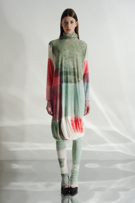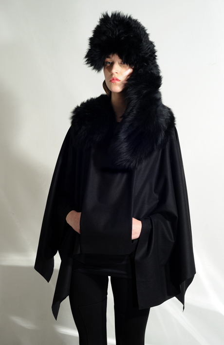 Bezüge zum Österreichischen gibt es aber schon. So ist das an Spritzgittertechnik erinnernde, handgedruckte Dessin von den Steinoberflächen der Alpen inspiriert und die Farbpalette (schwarz, grau, Rot- und Grüntöne) aus der Tracht abgeleitet. Für Mantel und Cape wird Loden verwendet, der urtypisch österreichische Wollstoff schlechthin.