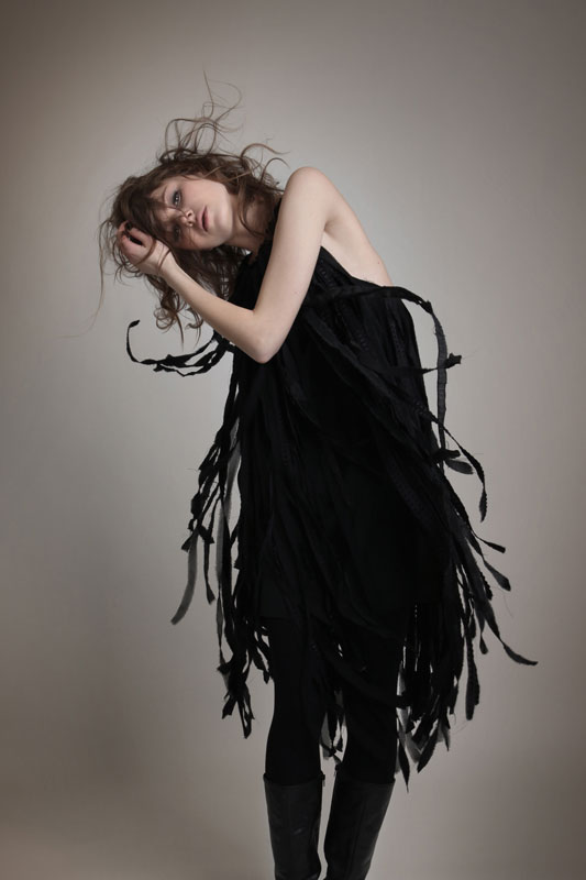 Mit einer schwarzweißen Variante ihres Kleine Schwarzen „ripped stripes“ einer Arbeit mit sorgfältig gerissenem, recycelten Material, schaffte Cepp es in die Finalrunde des Ringstraßen Galerien Designer Awards, der am 21. April vergeben wird. (Die Modelle der 10 FinalistInnen sind übrigens bis dahin im Hainisch-Hof der Ringstraßen-Gallerien ausgestellt.)