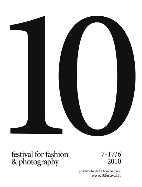 Das jährlich vom Verein Unit F organisierte festival for fashion and photography hat heuer die Ziffer 10 vorangestellt, findet zum 5. Mal in dieser Form statt – es muss ja nicht immer alles logisch sein – und zwar von 7.-17. Juni 2010 an verschiedenen Locations in Wien.