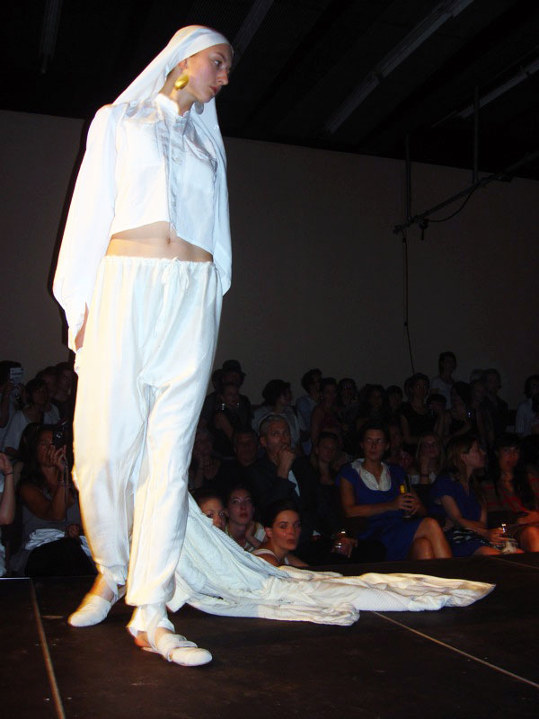 Unter der neuen künstlerischen Leitung – seit Herbst letzten Jahres stehen dem Studiengang Wally Sallner und Johannes Schweiger aka fabrics interseason vor – untermalten nämlich Mike Oldfields unsägliche Tubular Bells – was war ich damals froh, als diese endlosen, psychedelischen Konzeptalbenauswüchse endlich von knackigen 2 Minuten Punknummern abgelöst wurden – ein hochprofessionell vorgetragenes Defilee, das in ungewohnter Weise das Gemeinsame in den Vordergrund rückte.