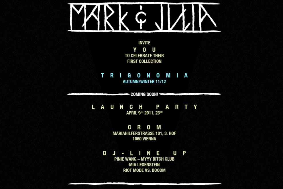 Mark Baigent und Julia Rupertsberger haben 2010 das Label Mark&Julia gegründet. Wir sind zwei Modebesessene, die ihre Fantasie mit anderen teilen wollen. Wir lernten uns vor 6 Jahren auf der Modeschule in Linz kennen. Nach vielen gemeinsamen kreativen und ereignisreichen Jahren entschlossen wir uns ein Modelabel zu gründen. Von den identen Vorstellungen von Ästethik und Seelenverwandtschaft geprägt entwickelten wir unsere erste Kollektion TRIGONOMIA.