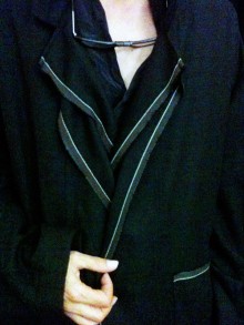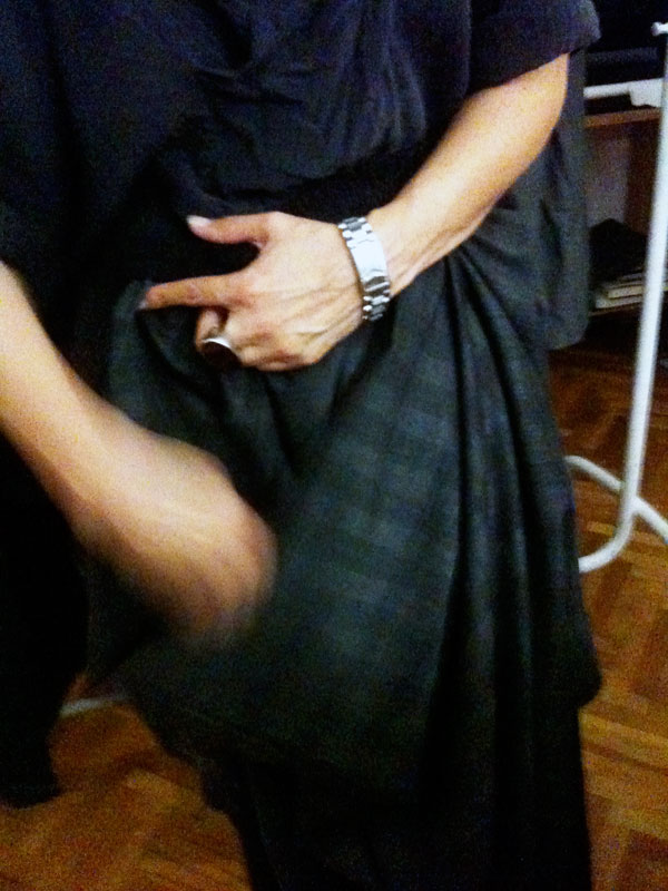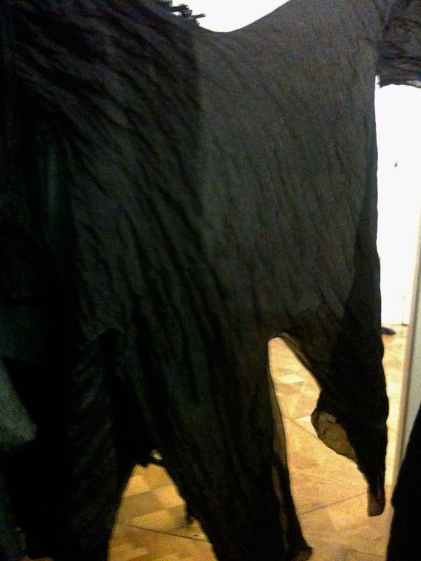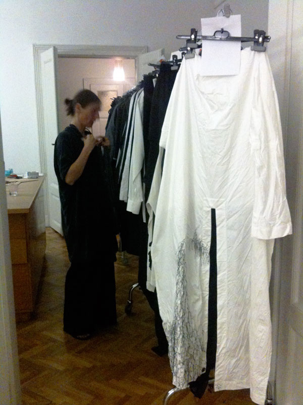 Sie zieht und verdreht Nähte und Revers, drapiert und verknotet schlauchige Teile, wattiert von Hand mit langen, bunten Heftstichen und hat sogar die Strickliesel für die Produktion von großen, dicken Schals neu erfunden.