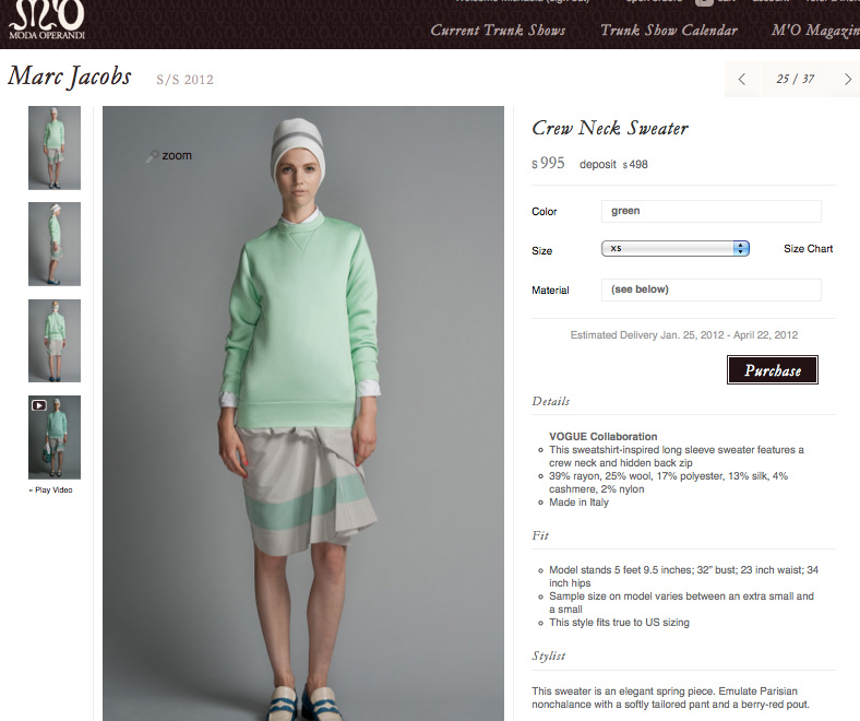 Und trotzdem. Mir würde es großen Spaß machen, gleich nach der – live gestreamten! – Show Look Nummer 25 aus der Marc Jacobs Kollektion für Frühjahr/Sommer 2012 einzukaufen. Auch wenn ich IRL sehr gerne gut kuratierte Konzeptstores besuche, so fühle ich mich doch kompetent genug, um aus der vollen Palette wählen zu können. Theoretisch. Budgetmäßig bin ich da ja leider nicht ganz die Zielgruppe.