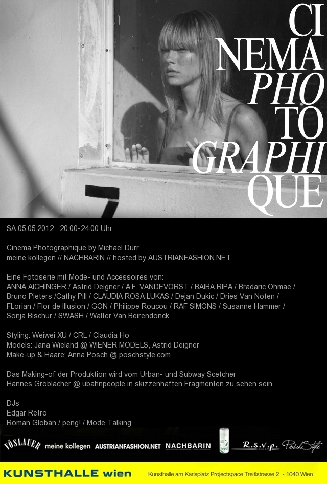 - Samstag, 5. Mai, 20 Uhr: hosted by AUSTRIANFASHION.NET, Styling: Weiwei Xu, CRL, Claudia Ho, Model: Jana Wieland (Wiener Models), Astrid Deigner, Make-up & Haare: Anna Posch, Zeichnungen: Hannes Gröblacher, DJs: Edgar Retro und Roman Globan