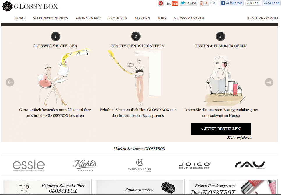 Eines der bekanntesten europäischen Unternehmen dieser Art ist GLOSSYBOX – nicht zuletzt dank hervorragender Social Media Arbeit. Einige tausend Unboxing Videos finden sich auf Youtube und in verschiedensten Blogs. Alle eifrigen Blogleserinnen wissen natürlich schon längst, wie cool die fünf Produktproben, die einmal im Monat gegen eine Abogebühr von 14 Euro (in Österreich) versendet werden, sind.
