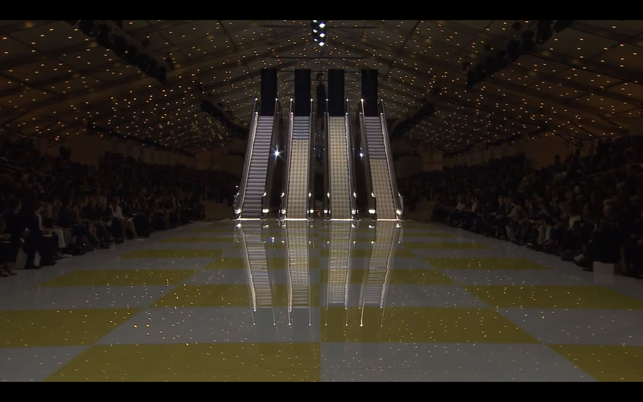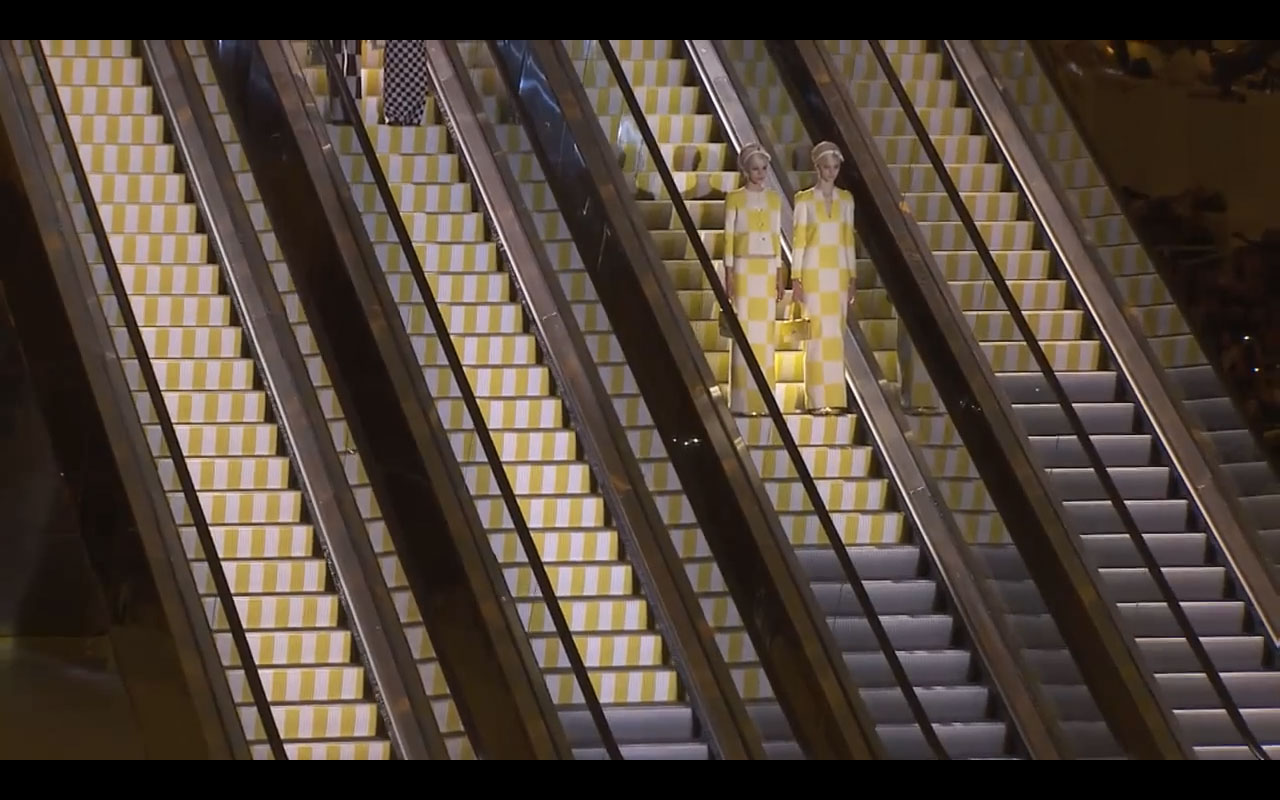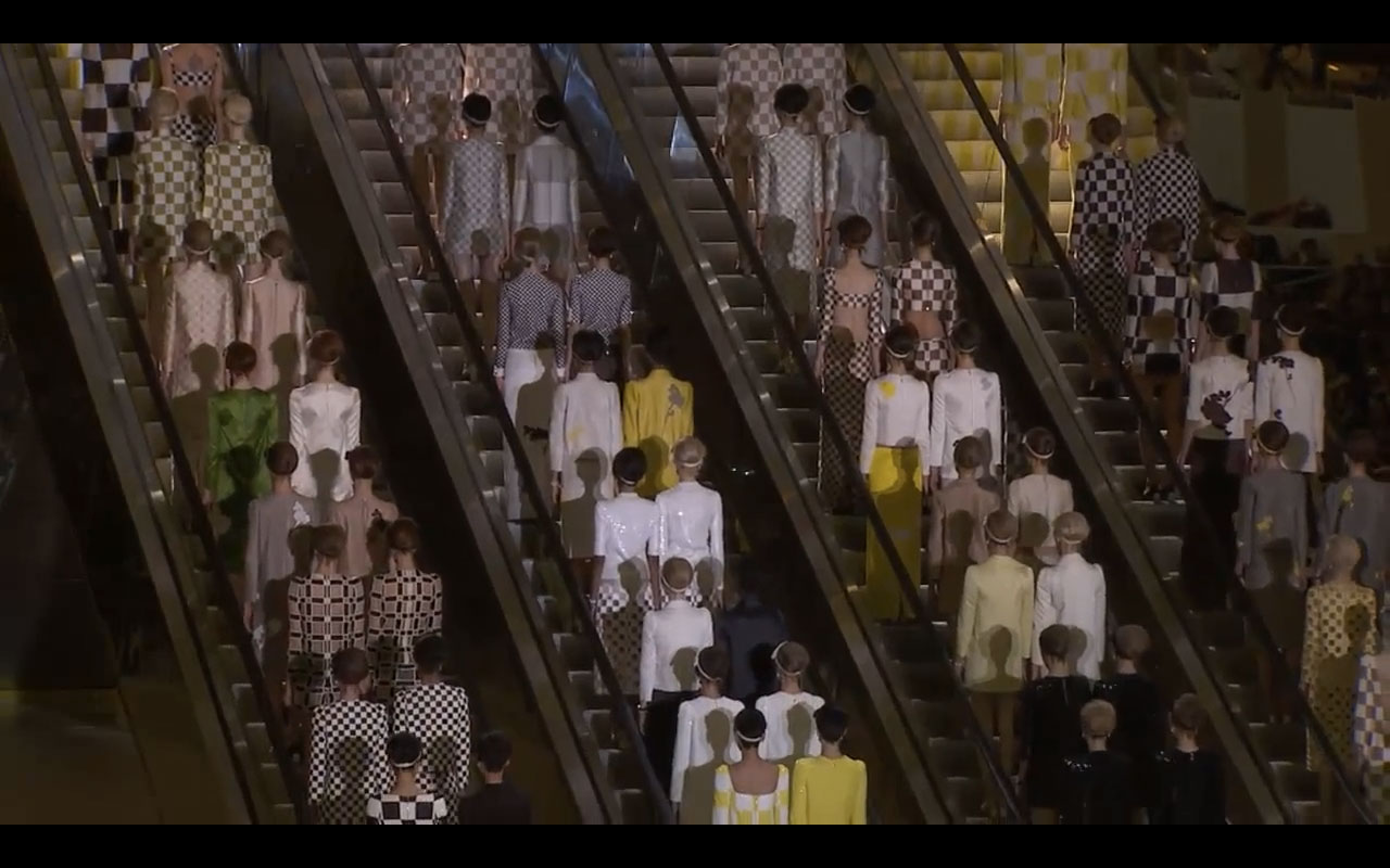 Paris Fashionweek, 3. Oktober 2012. Rolltreppen heuer. Nach Fahrstuhl, Dampflok und Ringelspiel ist Louis Vuitton im urbanen Getriebe angekommen. Wie auch schon davor spielt die Dramaturgie zur Musik von Philip Glass mit verschiedenen Tempi, Überlagerungen und Mustern. Daniel Buren – genau der mit den Säulen im Palais Royal – spielte auch mit. Die Choreographie geht schon mehr Richtung Tanzperformance denn Catwalk. Ein Vergnügen. Marc Jacobs freut sich auch.