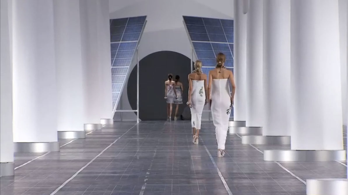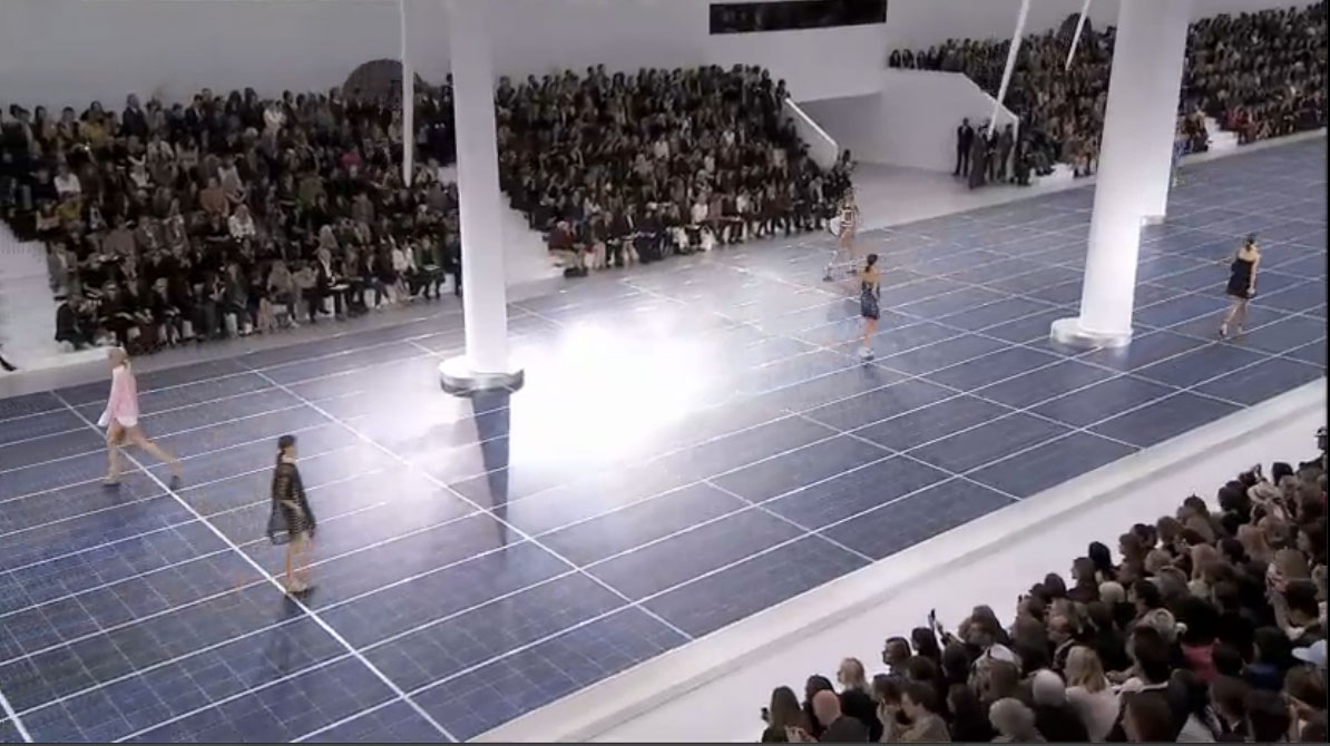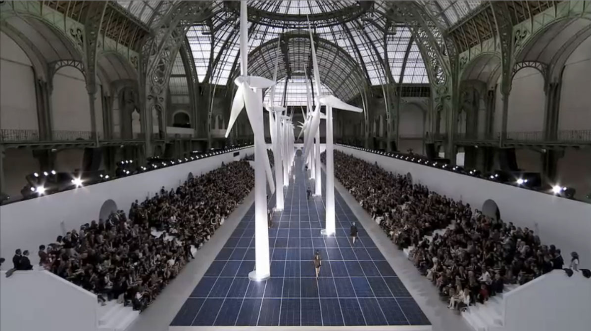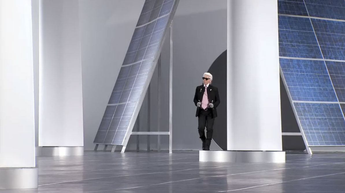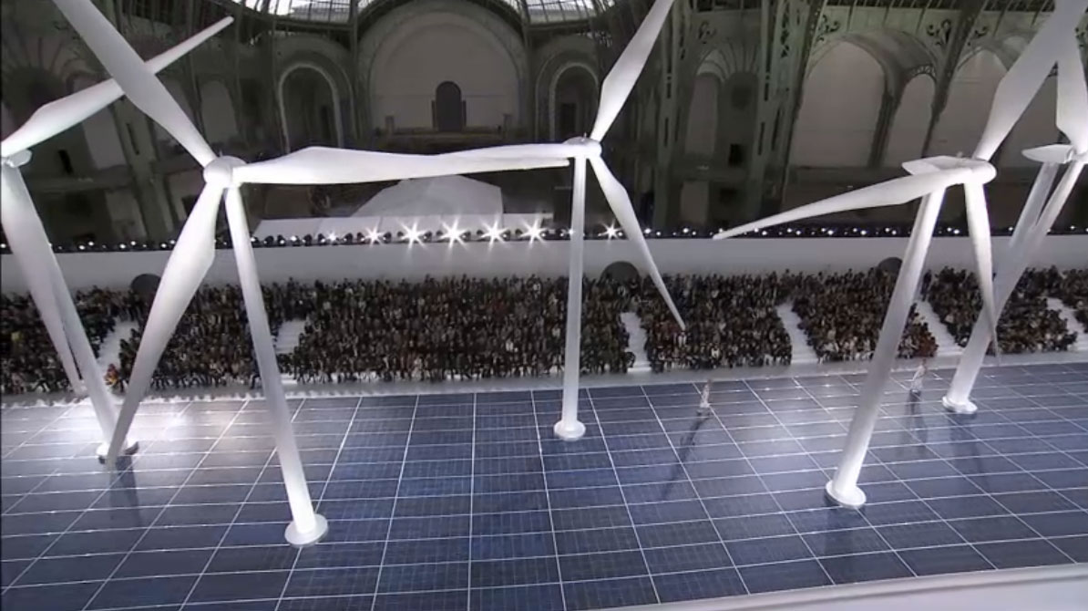 Paris Fashionweek, 2. Oktober 2012. Karl Lagerfeld treibt einmal mehr die große Kunst Mode mit einem Batzen Ironie stets neu zu erfinden auf die Spitze. Chanel bringt diesmal frischen Wind ins Geschehen. Und zwar sprichwörtlich. Ein ganzer Windpark auf einem überdimensionalen Laufsteg aus Solarzellen – überpowered im wahrsten Sinne des Wortes also – findet da Platz im Grand Palais, wo sonst. Green und Nachhaltigkeit als relevante Themen unserer Zeit? Ob sie auch in die Produktion einfließen, lassen wir mal beiseite. Die relevante Musik kommt live von den Chromatics.